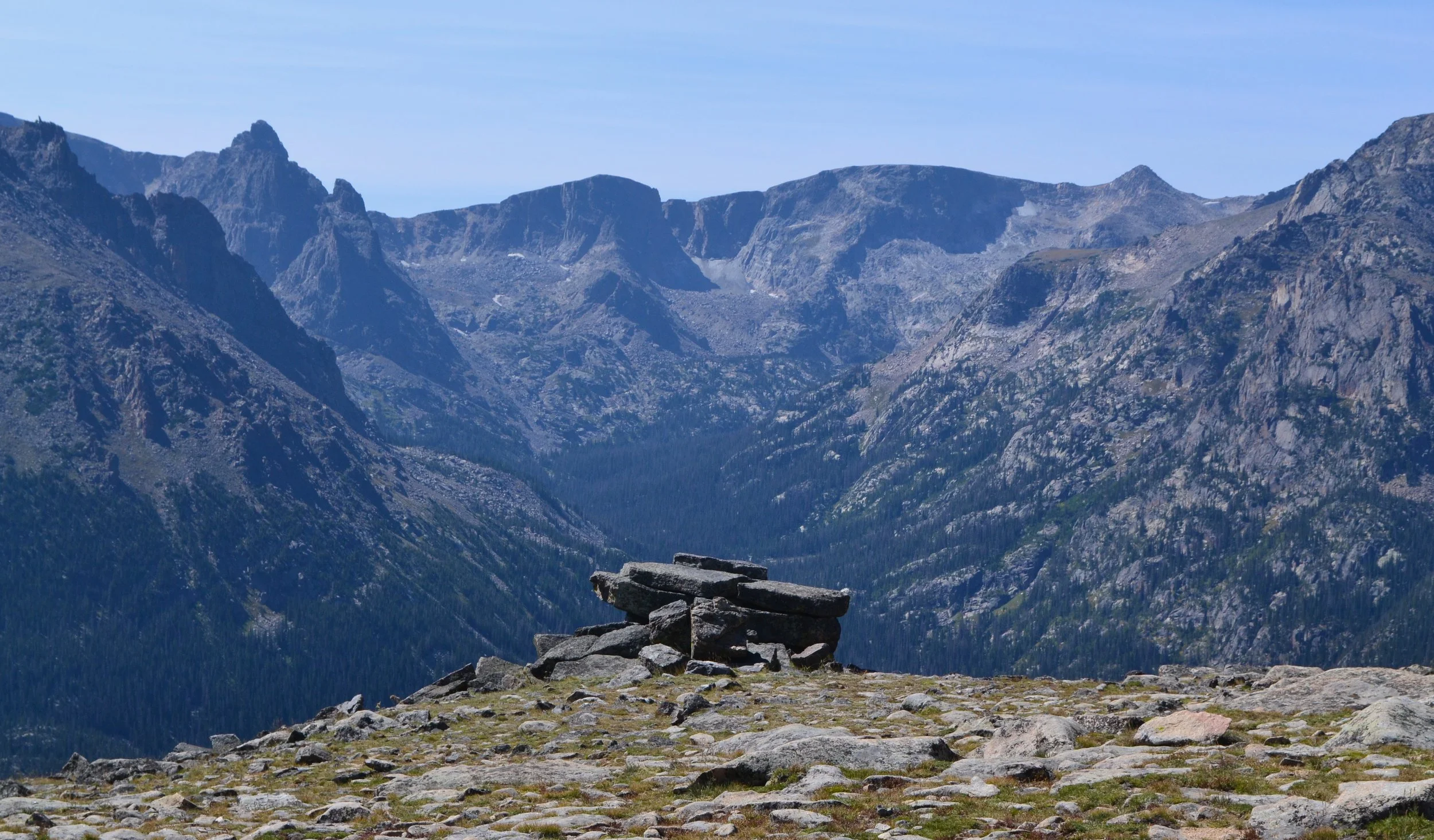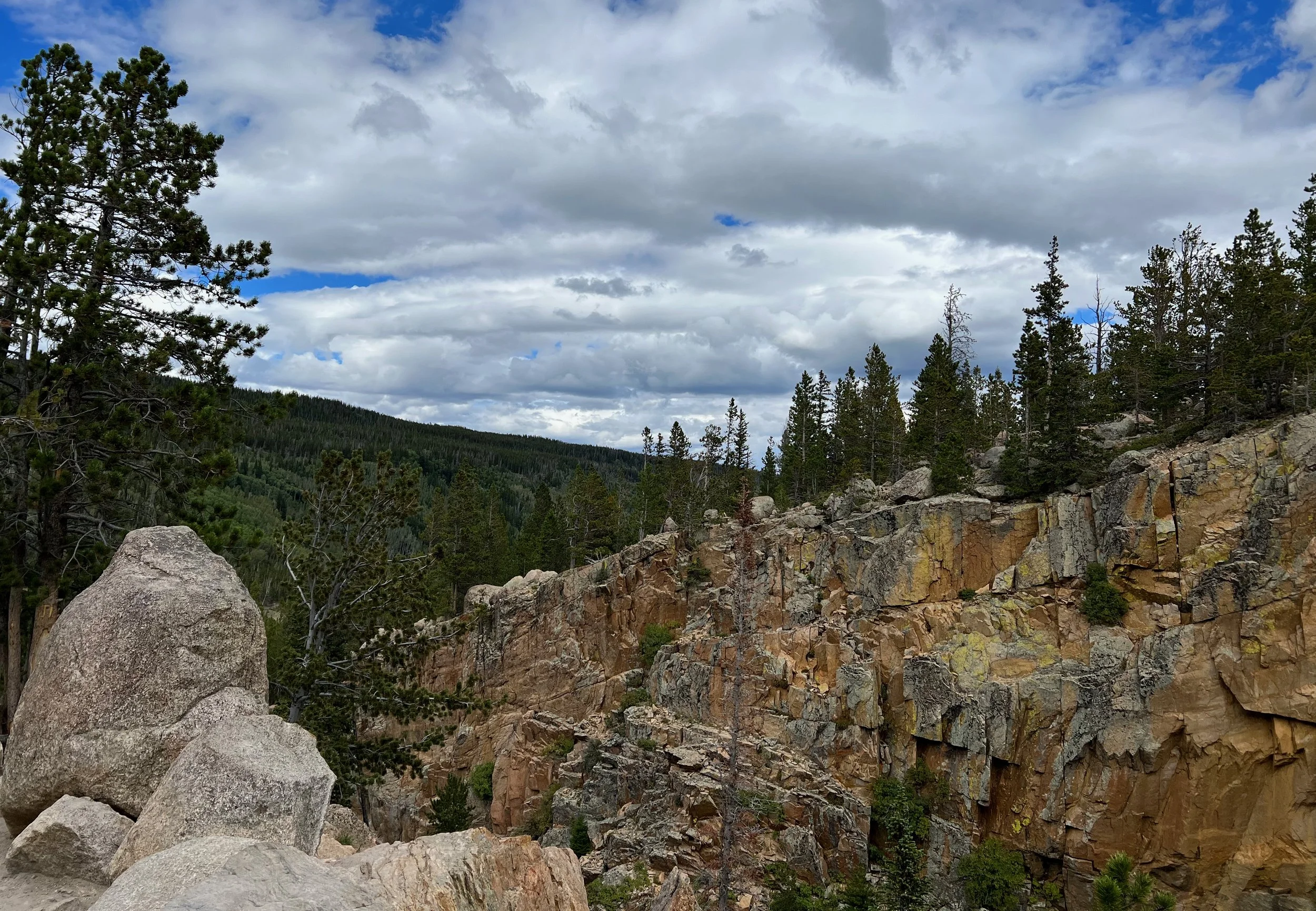 Looking across the Glacier Creek gorge on a hike to Sky Pond. I love the layering of rock here and the varying lines of rock, tree and mountain in the distance. When I stopped to take this photo I was struck by a sense of timelessness and time travel. To be able to see these formations exposed and in stunning color tells me the wordless story of this place and these mountains. How wonderful.
