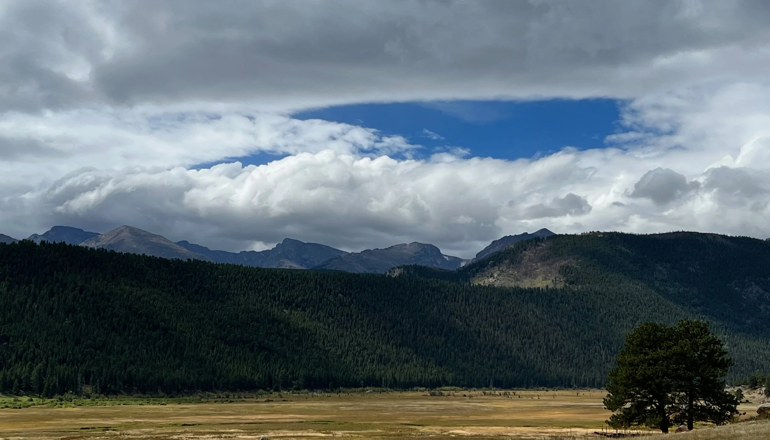 A late afternoon, early evening storm rolling over the high peaks and dropping into Moraine Park, Rocky Mountain National Park, Colorado. The rays of light hitting the faces of the mountains feels like a communication of sorts. As above so below.